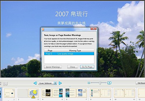 首先, 在預覽頁的右下角可以發現一個 Order Book 的按鈕, 按下去之後就是準備要上傳書本了, Book Smart 很貼心, 在這時會對照片作檢查, 發現解析度太差的相片會特別提醒你注意, 其實一早就有提示了, 在導覽頁上, 會看見有問題的那頁有個黃色驚嘆號出現, 點到那頁去, 會發現有個相機符號出現在解析度太低的相片上.