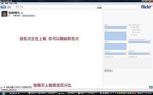 另一個進步的地方是: 開始上傳一批相片後, 整個程式又可以繼續動作, 可以處理下一批相片. 此為相片上傳的進度, 在這一版改成會以百分比顯示, 這樣比較有感覺(這張照片的紅字是我加的)
